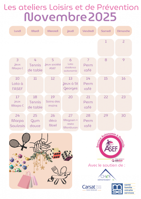 Découvrez le programme du mois de novembre proposé par l’ASEF (Service Autonomie à Domicile) :